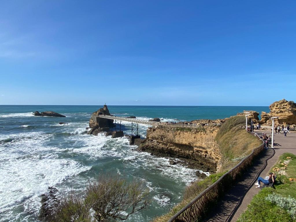 Primera parada, Biarritz (Francia), tuvimos la suerte que nos hizo unos días fantásticos, por lo que pudimos disfrutar de un agradable paseo desde el área de autocaravanas a la Rocher de la Vierge, una visita obligada, viendo toda la costa, su fuerte oleaje y la vida que da ver a tanta gente practicando surf o tomando un vino con queso al lado de la playa (me encanta este tipo de botellón sutil que hacen los franceses)