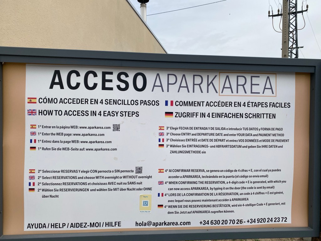 Días antes habíamos hecho la reserva con pernocta a través de la pagina web http://www.aparkarea.com, realizando el pago también, la pagina es muy intuitiva y dispone de tres tipos de reserva: