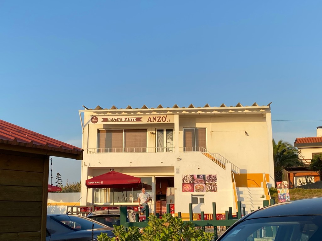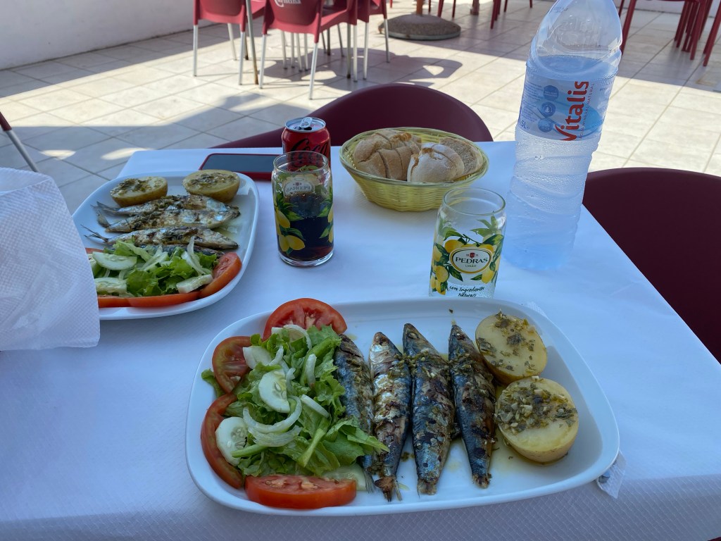 Comimos allí mismo, hay un bar / restaurante «Anzol», nos comimos un plato de sardinas cada uno, llevaban ensalada y patata asada, esta riquísimo todo y el hombre que lo lleva es encantador. Comimos estupendamente en una terraza mirando al mar. ¿Qué mas se puede pedir?